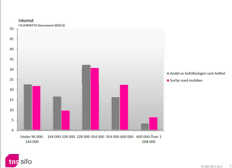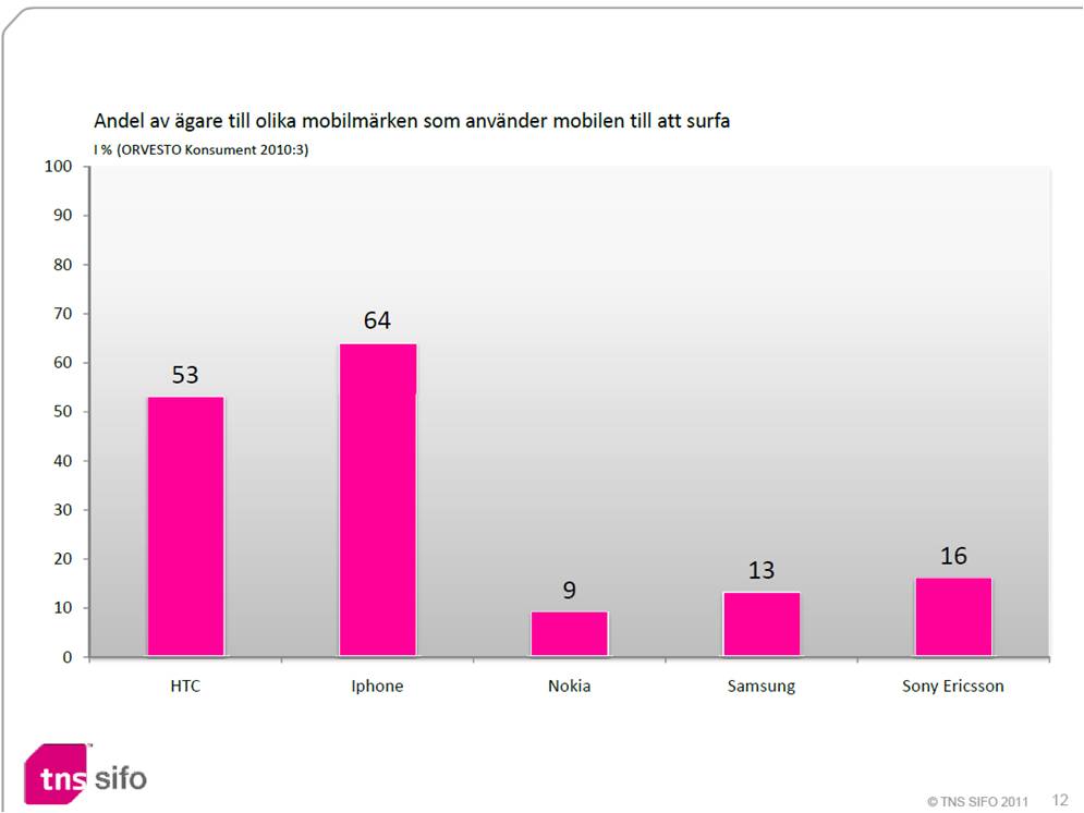 TNS Sifo har släppt en mycket trevlig studie om mobilsurfande. I mycket bekräftar den saker man visste tidigare, men det är ändå trevligt att ha det svart på vitt, samt att få lite mer detaljerad uppdelning av fakta.
