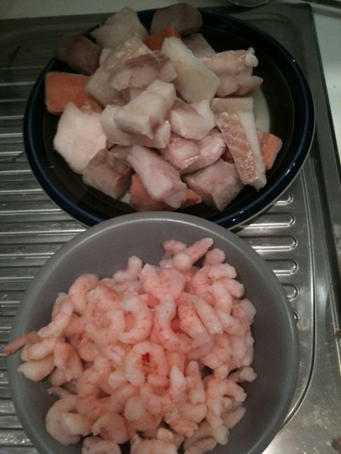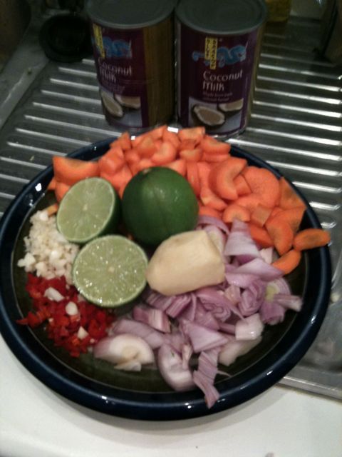Ganska enkelt i sin helhet: svetta lite morötter o lök i olja, på med vitlök och chili.. Sen kokosmjölk, ingerfära, lime och buljong. På slutet fisk o räkor, samt lite lime och koriander till garnering.