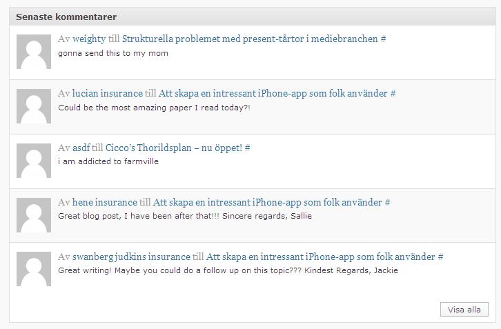Dyker upp en del spam-kommentarer på bloggen, automatgenererade kommentarer som med smicker ska få mig att bli nyfiken och klicka mig till deras site (där de sen ska ge mig virus eller försöka sälja på mig viagra).