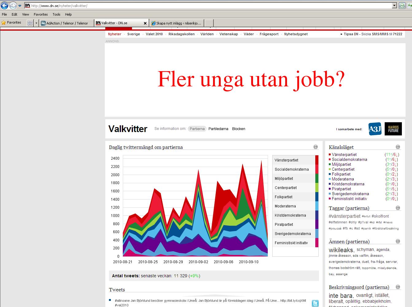 DN:s valkvitter samlar tweets om våra riksdagspartier. Kanske inget man kan utläsa några revolutionerade data ut (vanligaste beskrivningsord för ett parti är ”inte bara”. Vad skall jag göra med den upplysningen?). Däremot en riktigt kul och snygg demonstration av hur man kan samla strömmar om något på ett överblickbart sätt.