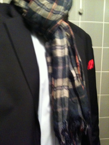 Höll föredrag idag, vilket innebar kavaj på. Min förkärlek för scarves relaterade ”wannabe-kreatör-kombon” kavaj+scarves. Kändes rätt bra.