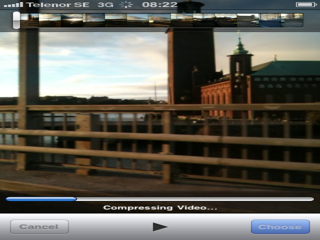 Spelade in en liten snutt av resan förbi stadshuset, resultat nedan.. Videon nedan, tänker ni. Ånej, nedan finner man en bild på när appen komprimerar videon. Detta är nämligen allt den pallar göra innan den krashar. Försökte 5 gånger utan någon skillnad i resultatet.
