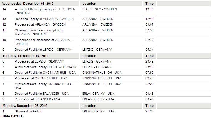 Inte bara sparade jag 400 spänn jämfört med att köpa dem i Sverige, jag fick dessutom en ny hobby; Att minst en gång i kvarten gå in och tracka mitt paket på DHL.com. Sjukt kul! Efter en sejour i Leipzig inatt är paketet nu i Stockholm och har gått igenom tullen – mindre än 2 dygn efter att jag beställt dem!!