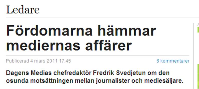 Här var en liten rolig krönika från Fredrik Svedjetun som jag missade. Likt många andra kastade jag mig direkt in i snaskeriet om säljarna i senaste numret av Dagens Media, och missade dessa tankar om redaktionell integritet och kreativt sälj.
