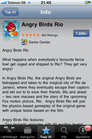 Angry Birds får en massa draghjälp till nya spelet genom annonseringen för filmen. Genom interaktionen med karaktärerna i spelet och länkar till treailers byggs relation med Rio-konceptet. OCH Rovio tjänar pengar på det genom att stora versionen av spelet kostar 7 kr st. Win-win så att säga. Sjukt nyfiken på hur den dealen ser ut.