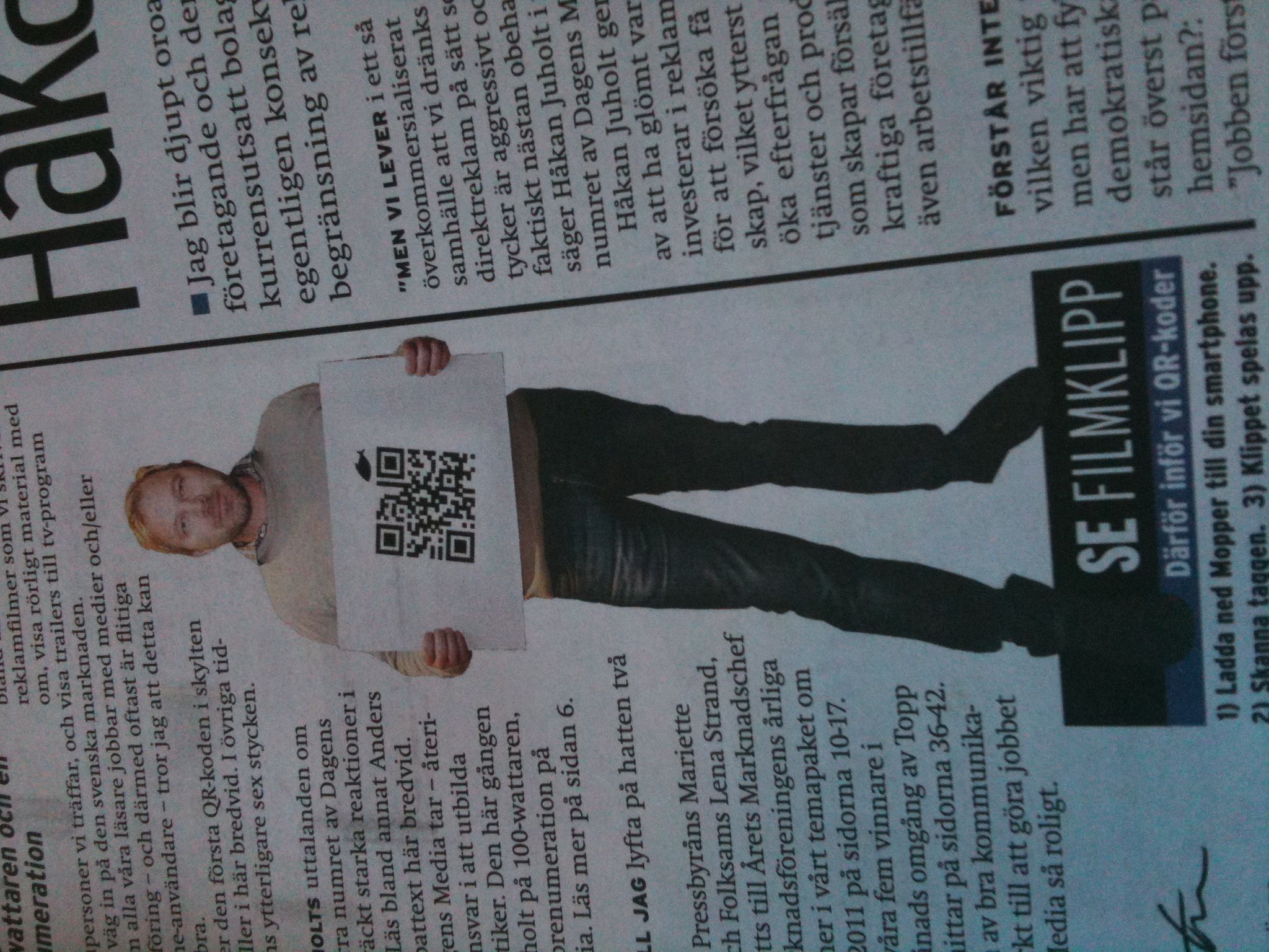 Kul att man börjar använda QR-koder i Dagens Media. Det finns kanske inget jätteanvändande generellt i Sverige idag (i USA säger statistiken 6,2% ). Men är det någon i Sverige som har en målgrupp detta passar för är det Dagens Media – innovationskåta mediemänniskor med 100% smartphone-täckning 🙂