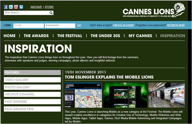 Som både Resumé och Dagens Media rapporterar idag kommer reklamtävlingen Cannes lions införa en ny kategori för mobilt. Känns ju riktigt kul att man sätter specialfokus på denna växande kategori – konsumenterna har redan skapat ett mobilt beteende och medievolymerna finns där. Det som halkat efter är annonsörerna, bäde vad gäller köp av medievolymer och utformning av roliga mobila kampanjer. Förhoppningsvis blir detta en inspiration för att förändra det framöver.