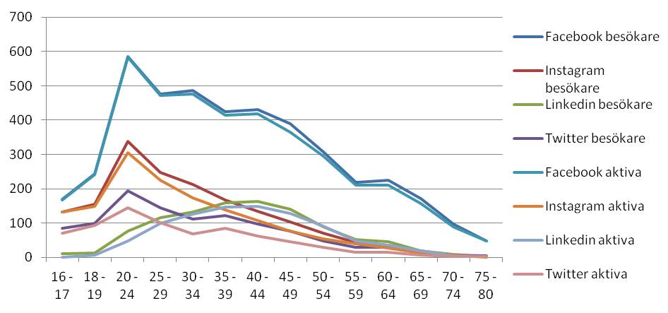 Om man räknar de som säger sig ha minst en vän som aktiva i sociala nätverk, så framgår det att twitter har störst skillnad mellan de som anger att de ”besöker” och de som är ”Har vänner/följare”. Icke desto mindre är det 743 000 personer som anger sig ha minst en följare på Twitter, ett högre antal än i alla fall jag hade gissat tidigare. 1 451 000 personer är aktiva på Instagram, 4 148 000 på Facebook och 911 000 på LinkedIn.
