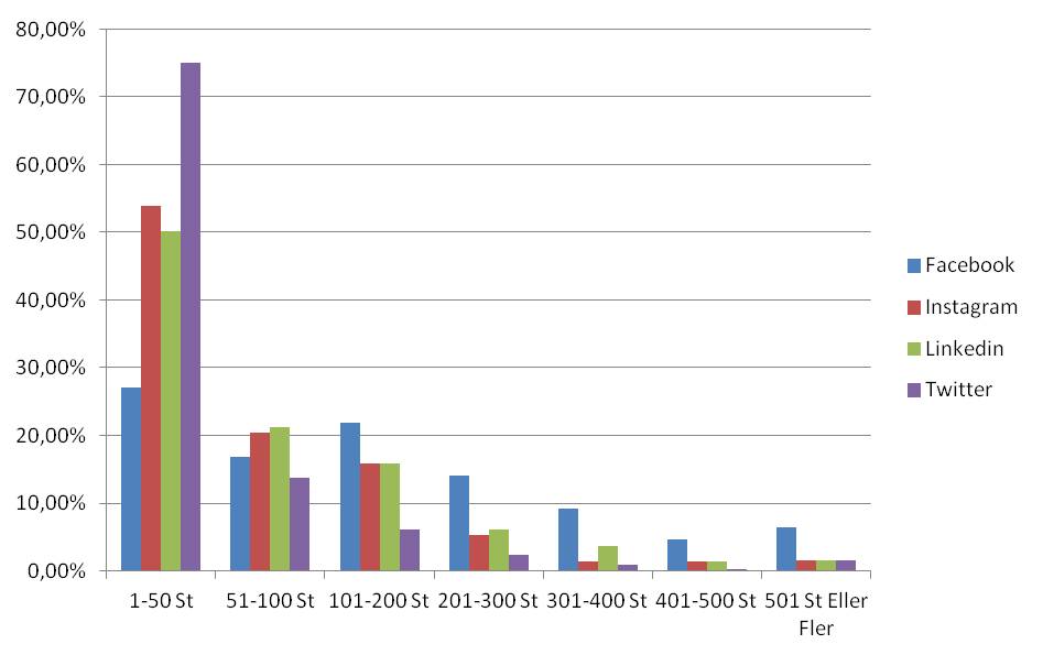 Intressant att följa är också hur många av de aktiva som har en stor mängd följare. Det har ju en inverkan på möjligheten att skapa kampanjer som för stor social spridning från vänner till vänner. Här ser man att det är Facebook som står ut med störst andel av de aktiva medlemmarna som har många kontakter. Twitter har störst andel med 1-50 följare (över 75%) och bara 5,1% med över 200 följare. Motsvarande siffror för Facebook ör 27% resp 34%, och för Instagram 54% resp 10%.