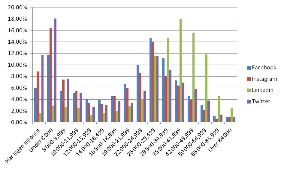 Twitter har högst andel personer som tjänar under 10 000 per månad – men man har också en ganska hög andel användare som tjänar över 50 000 (där slås man bara på fingrarna av LinkedIn).